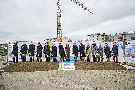 Baustart für Wohnbauprojekt in Enns: Am 24. Februar fand in Enns die Spatenstichfeier für den ersten Bauabschnitt mit 55 Mietwohnungen mit Kaufoption…