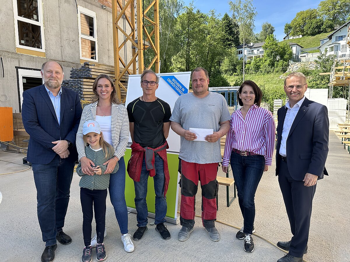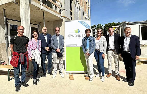 Am Bild v.l.n.r.: Ing. Mag. Werner Blaimschein, Mag. Martina Lauß und Bmst. Ing. Christoph Retschitzegger (OÖ Wohnbau), Mag. Arch. Markus Fischer (F2-Architekten ZT GmbH), Bürgermeisterin Mag. Doris Staudinger, Mag. Christina Haller und Bmst. DI Roland Schimpelsberger (GF Baufirma Haller), Ing. Dr. Jürgen Harich (GF OÖ Wohnbau)