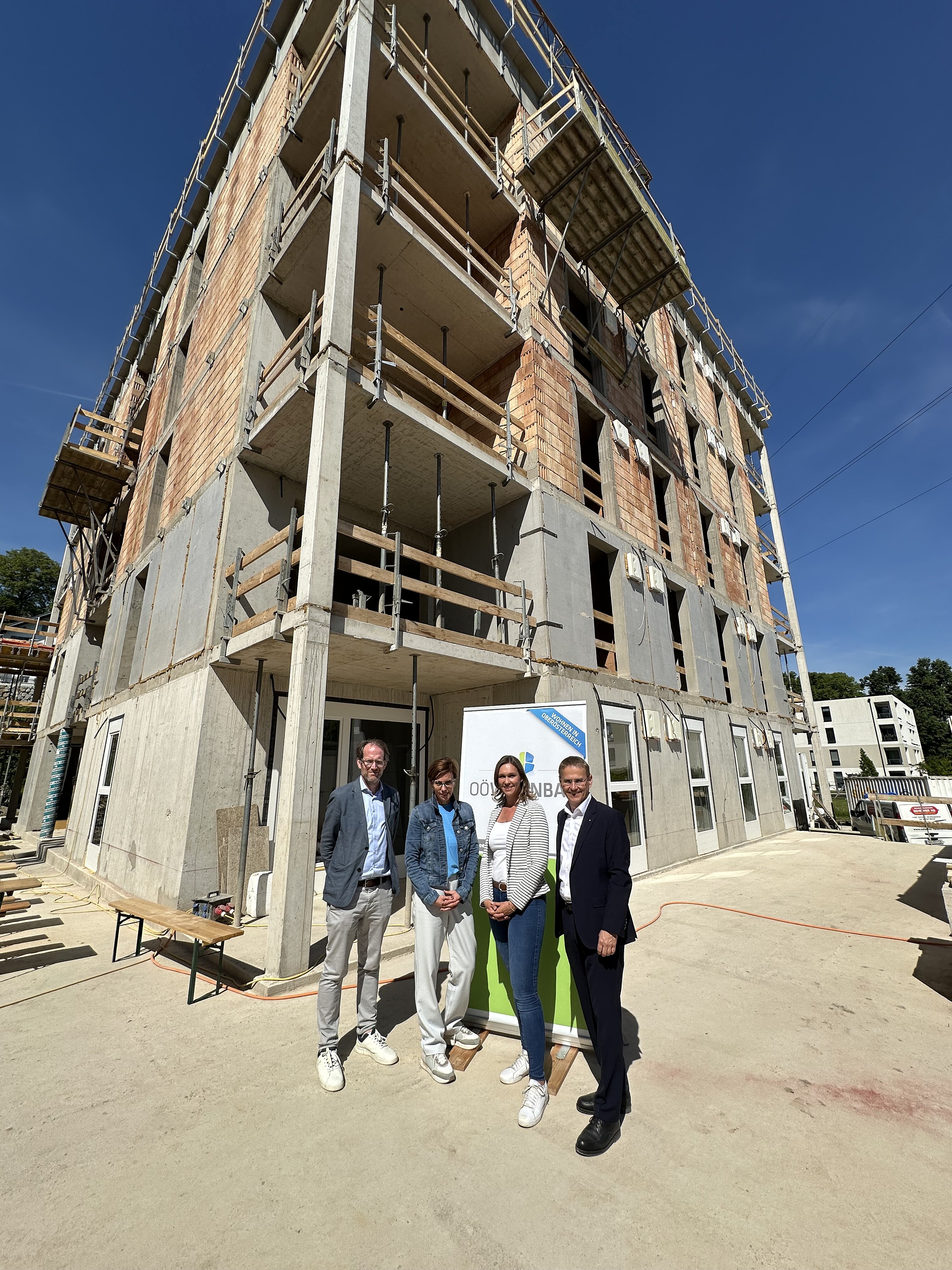Nach Fertigstellung des ersten Bauabschnitts mit den Häusern 1–3, die 12 geförderte Eigentumswohnungen sowie 35 geförderte Mietwohnungen umfassen, errichten wir nun im zweiten Bauabschnitt zwei weitere Wohnhäuser mit insgesamt 43 geförderten Mietwohnungen mit Kaufoption. Die Gleichenfeier fand am 14. Mai im Beisein geladener Ehrengäste sowie von Mitarbeiter:innen der OÖ Wohnbau und der Baufirmen statt.