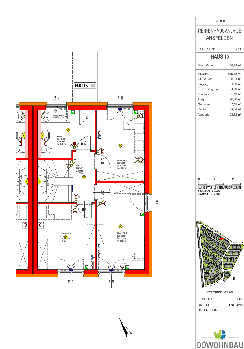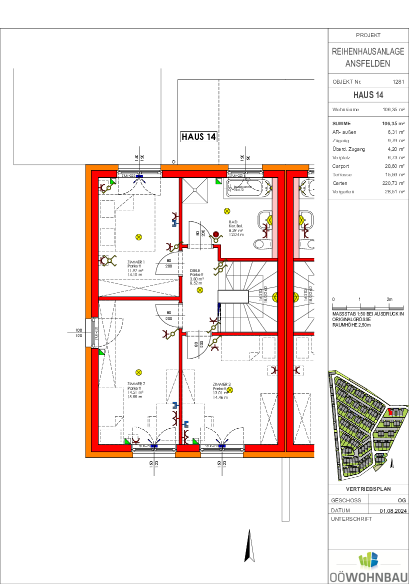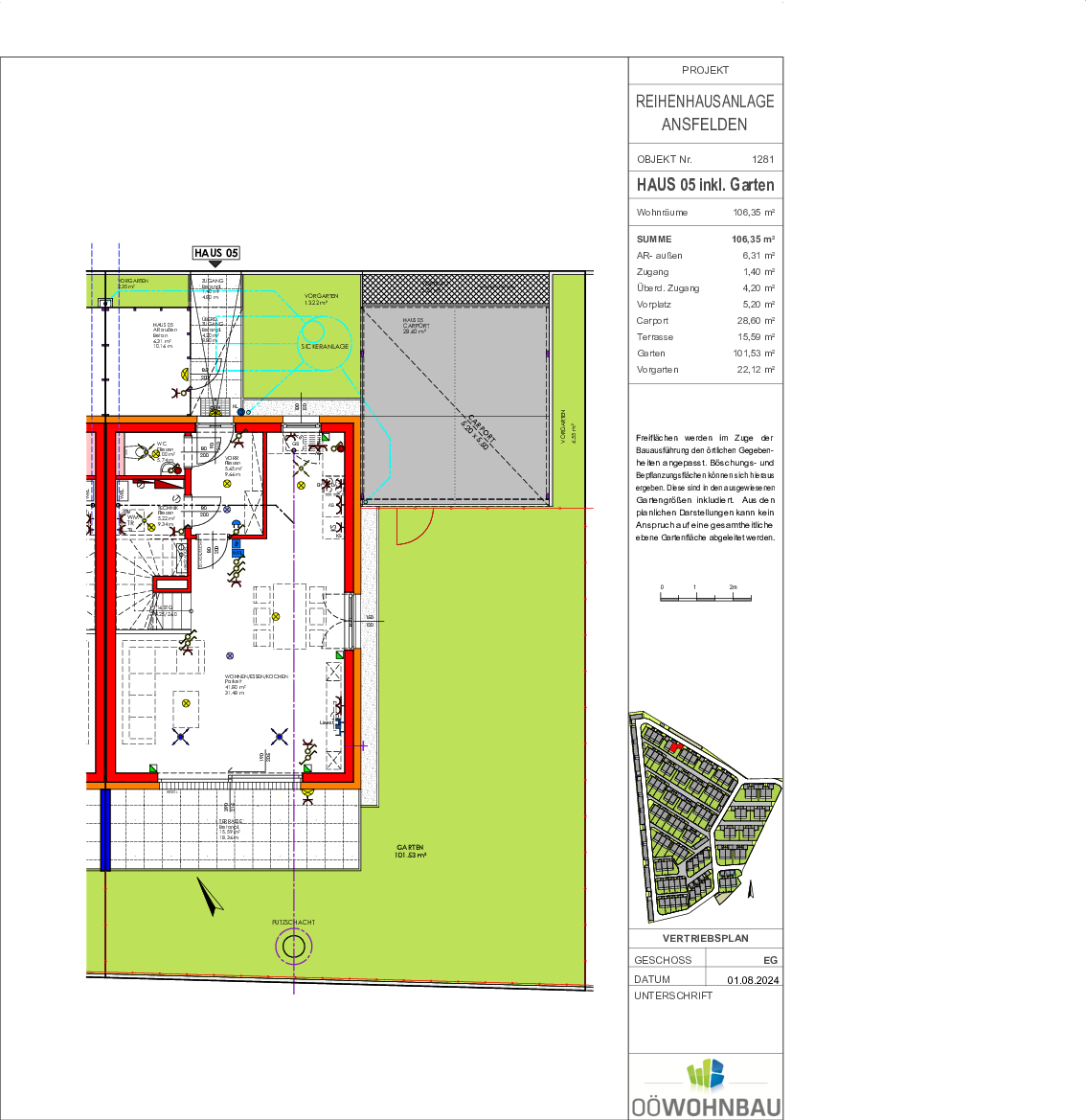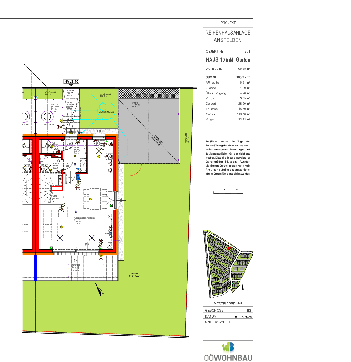 Die Wohnfläche je Doppelhaushälfte beträgt 100 bzw. 106 m². Jedes Haus reicht über zwei Geschoße. Neben einer großzügigen Terrasse verfügt jede Einheit auch über einen Eigengarten.