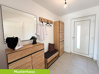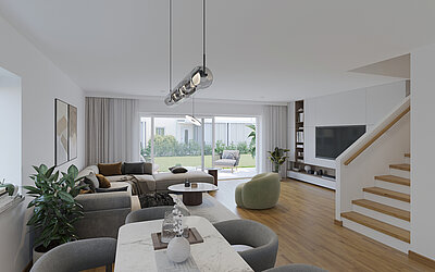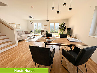 Im Erdgeschoß befindet sich der Vorraum, ein Abstell-/Technikraum, ein WC, die Küche und der Wohn- bzw. Essbereich mit Ausgang auf die Terrasse bzw. in den Garten. Die dem Wohn- bzw. Essraum vorgelagerte Terrasse und der Gartenanteil sind nach Süden bzw. Südwesten ausgerichtet. Im ersten Obergeschoß sind zwei Kinderzimmer, ein Elternschlafzimmer, das Bad mit WC situiert.
