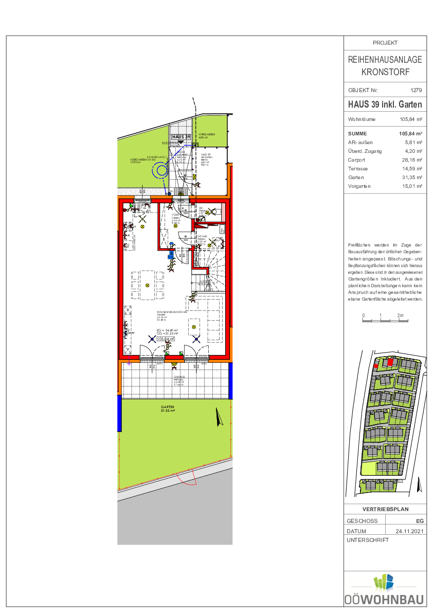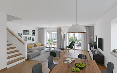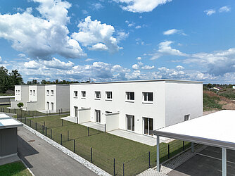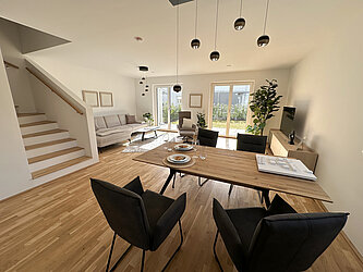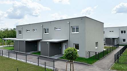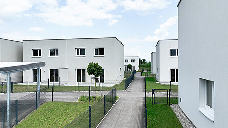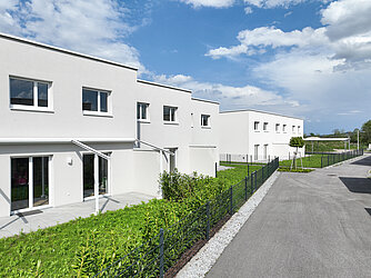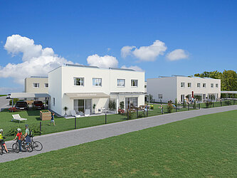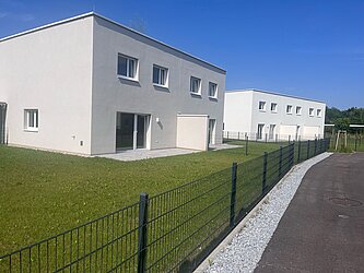 Die Wohnfläche der Doppel- bzw. Reihenhäuser beträgt ca. 106 m² und jedes Haus reicht über zwei Geschoße. Neben einer großzügigen Terrasse verfügt jede Einheit auch über einen Eigengarten.