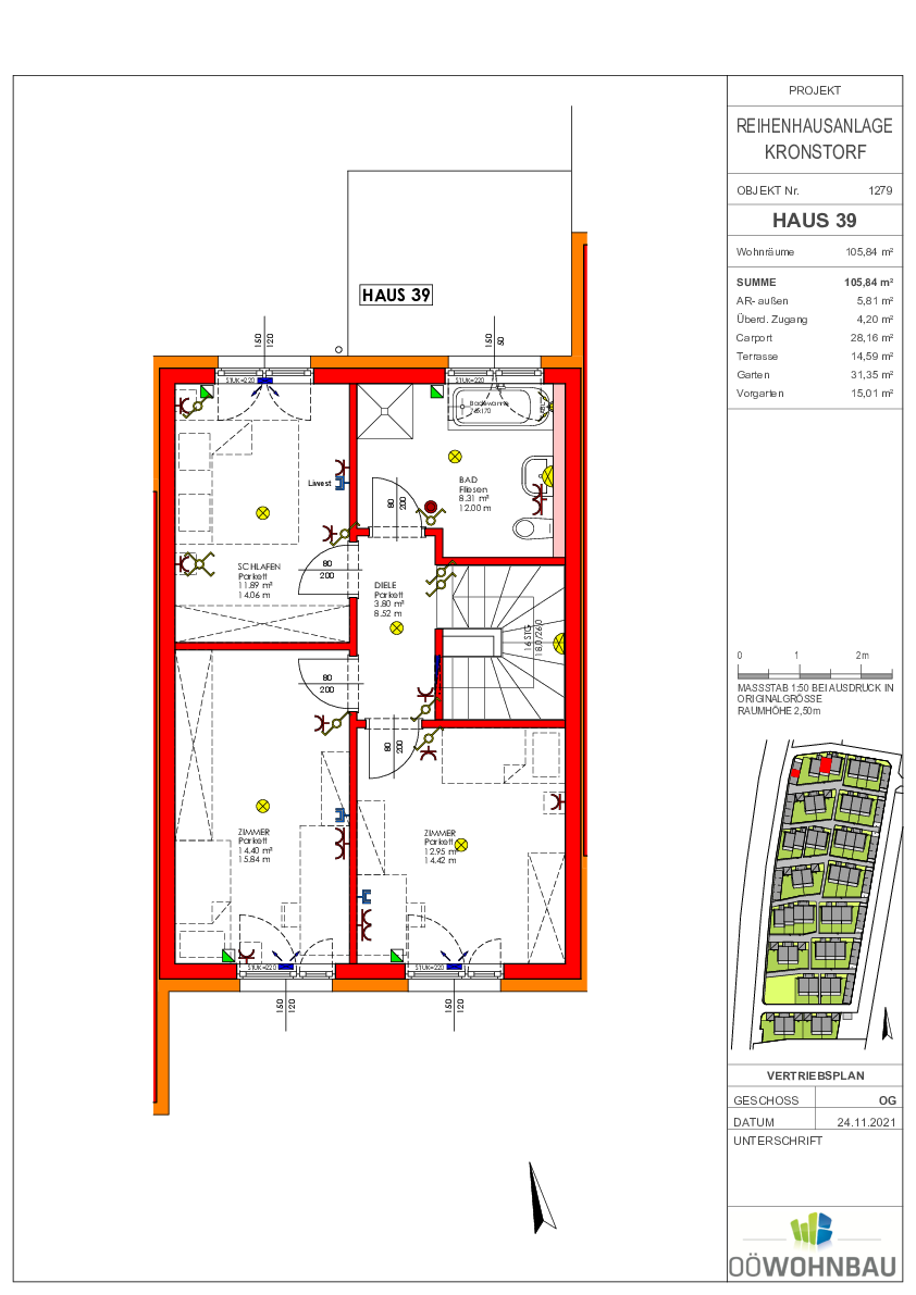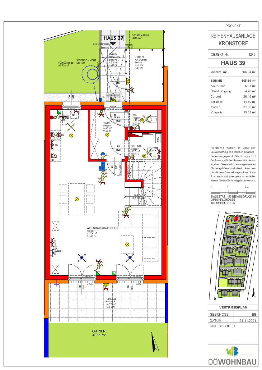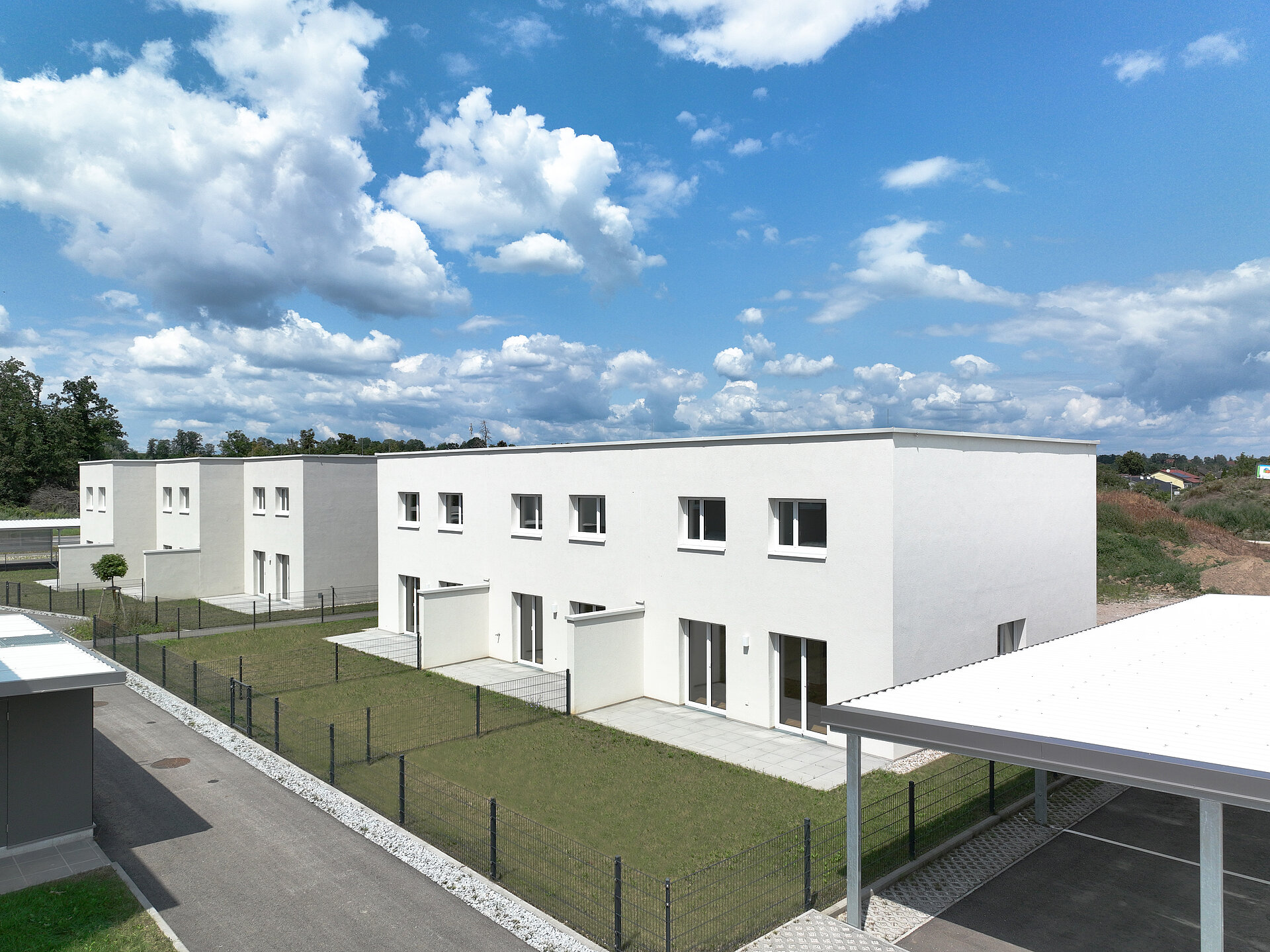 Jedes Haus hat zwei überdachte Stellplätze. Die Häuser wurden ohne Keller errichtet und verfügen über einen Kellerersatzraum im Bereich des Eingangs.