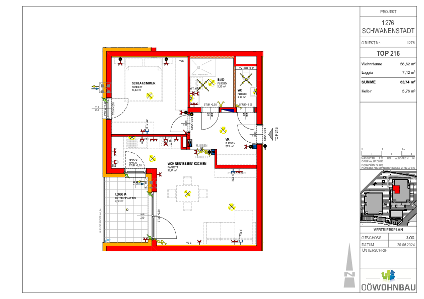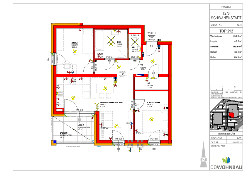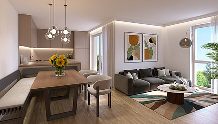 Die geplanten 2-Raum-, 3-Raum- und 4-Raum-Wohnungen haben eine Wohnfläche zwischen 56 m² und 89 m². Jede Wohneinheit verfügt über eine Freifläche in Form eines Balkons/Loggia mit ca. 7 - 8 m². Im Erdgeschoß ist eine Terrasse/Loggia mit Eigengarten zugeordnet.