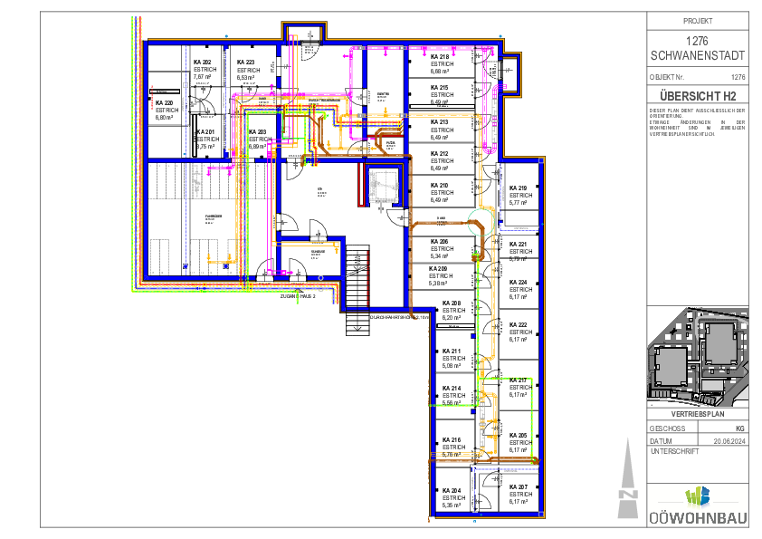 Im Kellergeschoß sind Kellerabteile, Wasch-/Trockenraum, Fahrradraum, Elektrotechnik und Haustechnik untergebracht. Zusätzliche überdachte Fahrradabstellplätze befinden sich neben den Hauseingängen.